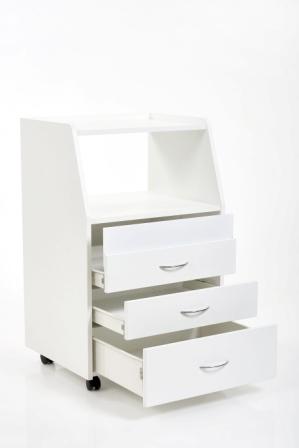 Столик сделан из ламинированного ДСП и оснащен тремя выдвижными ящиками и высокой открытой полкой.
