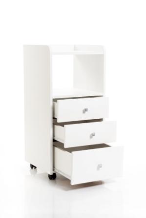 Стильный и функциональный передвижной столик на колесиках «КОМПАКТ 1» с тремя ящиками и открытой полкой. Предназначен для хранения инструментов и косметики в маникюрном, косметологическом или массажном кабинете.